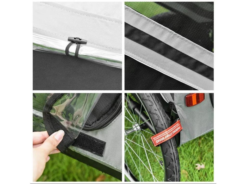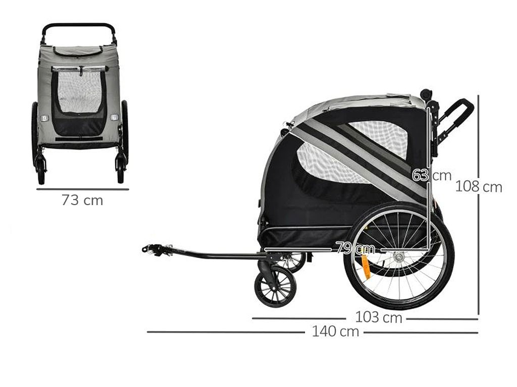 Remorcă pentru bicicletă 2 în 1 pentru câini de până la 20 kg, remorcă pentru bicicletă și cărucior, construcție robustă și impermeabilă, cadru din oțel, husă din material Oxford, uși cu fermoar față și spate din plasă , ușă frontală suplimentară din plastic , ușă superioară din material textil, laterale ale căruciorului din plasă, roți spate gonflabile Ø50cm, roți față pivotante EVA, cu lesă de siguranță, reflectorizante de siguranță și steag, dimensiuni interioare 79x55x63cm, dimensiuni ca remorcă 140x72,5x108cm, dimensiuni ca cărucior 103x73x108cm.