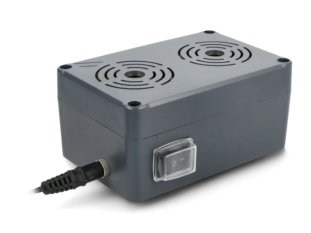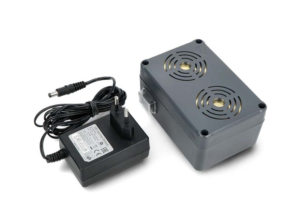Dispozitivul este alimentat de un adaptor de 12V , care este inclus în pachet. Repelentul are un comutator practic de pornire/oprire într-o carcasă de protecție, datorită căruia îl puteți opri și porni cu ușurință fără a fi nevoie să deconectați adaptorul de la rețea.