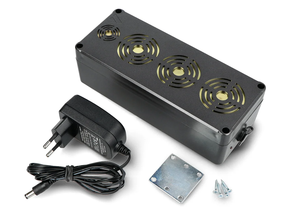 Dispozitivul este alimentat de 2 baterii reîncărcabile Li-Ion de 2000 mAh (4000 mAh) cu o durată de viață a bateriei de până la 200 de zile , care se încarcă cu un adaptor de 12V (inclus în pachet). Mufa de încărcare poate fi închisă cu un capac de cauciuc, care îl protejează de intemperii. Repelentul are un comutator practic de pornire/oprire într-o carcasă de protecție, datorită căreia îl puteți opri și porni cu ușurință fără a fi nevoie să deconectați adaptorul de la rețea.