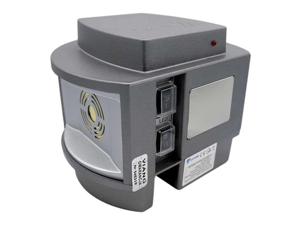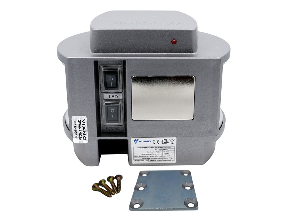 Dispozitivul generează semnale ultrasonice neplăcute pentru jderi și rozătoare, iar ca urmare, acestea părăsesc zonele protejate după scurt timp. Dispozitivul emite sunete cu o frecvență variabilă datorită modulului încorporat. Această schimbare automată a frecvenței asigură că dăunătorul nu se obișnuiește cu sunetul și nu se mai întoarce. Repelentele VIANO conțin difuzoare piezoelectrice, cunoscute pentru performanța lor ridicată, iar datorită reflexiei ultrasunetelor de pe suprafețele solide, au o gamă sonoră atât de largă în zonele interioare, cât și exterioare. În plus, acest repelent are și lumini LED care clipesc stroboscopic la o frecvență de 5 clipiri pe secundă atunci când este detectată mișcare.
