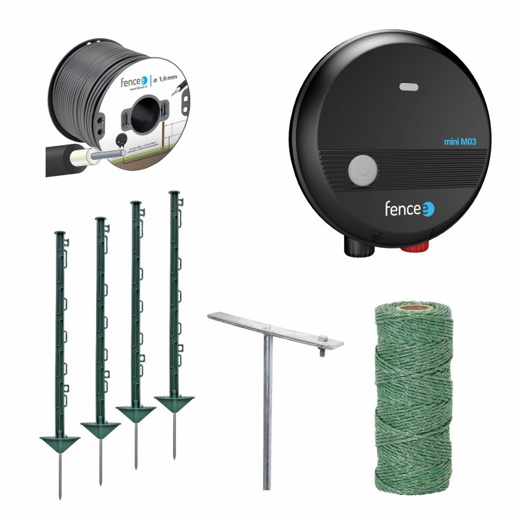 Un set complet special pentru gard electric, conceput pentru a proteja terenurile, de exemplu, iazurile, cotețelele de găini, cuștile de iepuri sau clădirile de vizitatori nedoriți, cum ar fi vidrele, jderii, vulpile, pisicile, stârcii, iepurii de câmp, șobolanii și alte animale mici. Gardul este alimentat de generatorul de rețea fencee mini M03, care, cu o putere de 0,3 J, este utilizabil universal pentru garduri scurte de până la 5 km lungime . Stâlpii solizi din plastic verde vă permit să instalați cablul până la o înălțime de 56 cm . Cablul verde universal de înaltă calitate, cu 3 fire din oțel inoxidabil, permite instalarea pe o lungime de până la 100 de metri.