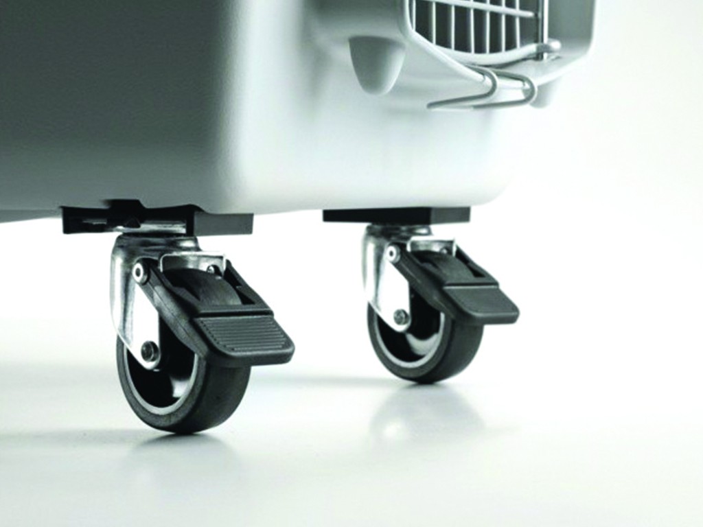 Set de roți pentru cutii de transport GULLIVER 4, 5, 6, 7 și TOURING, suprafață cauciucată antiderapantă , 2 roți pivotante cu frâne, montaj ușor al suportului de roți conform instrucțiunilor, roțile pot fi scoase din suport și depozitate.