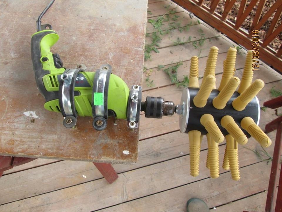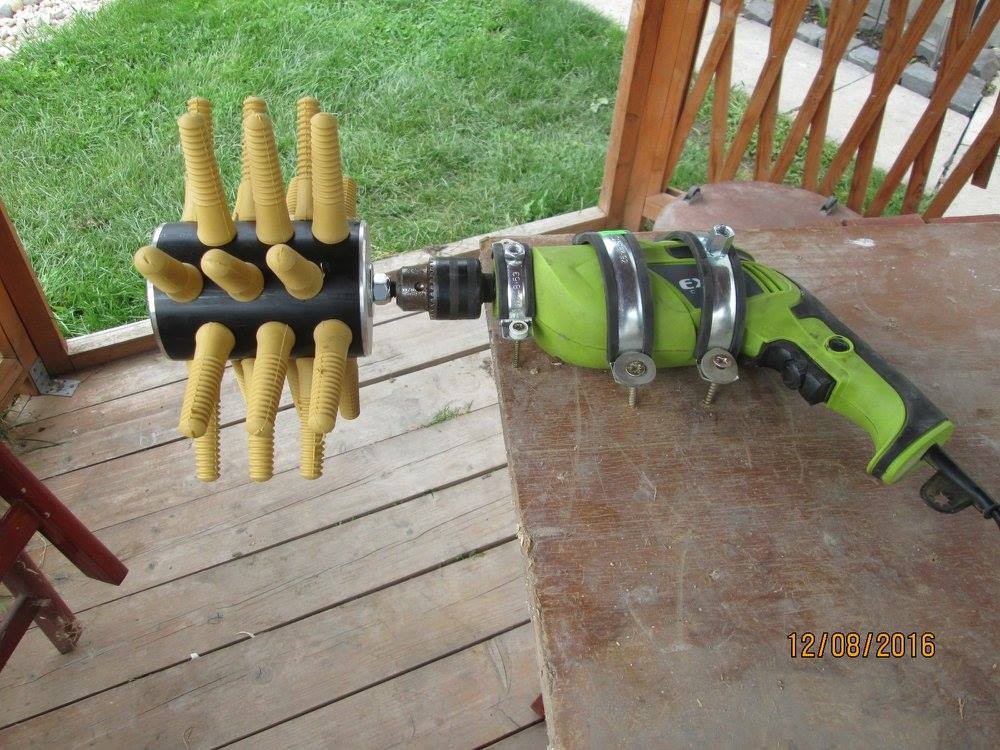 Pentru utilizarea corectă a produsului , acesta trebuie atașat la un dispozitiv (se recomandă o bormașină - nu este inclusă) care se va roti odată cu produsul . Recomandăm atașarea dispozitivului care va fi utilizat pentru rotire la o suprafață de lucru (de exemplu, la o masă folosind manșoane de prindere sau cleme), vezi imaginea de mai jos.