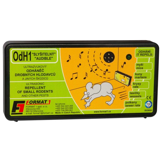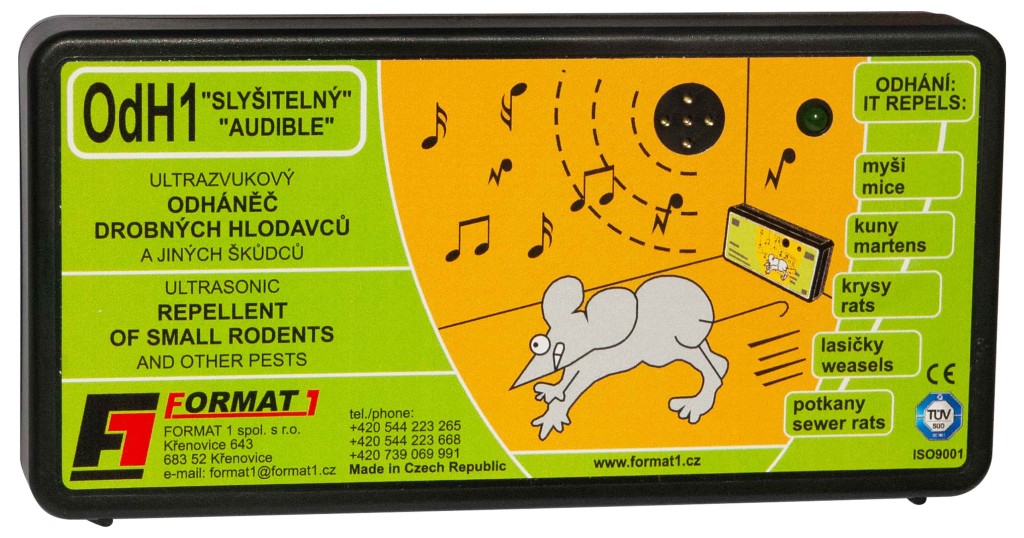 Repelent electronic cu ultrasunete pentru șoareci , jder , șobolani, nevăstuici și șobolani. Acesta este un produs pur ceh, cu o lungă tradiție pe piață (din 1991), fabricat direct în compania noastră FORMAT1 spol. s ro. Fiabil, puternic, dovedit de mulți clienți de peste 29 de ani. Inofensiv atât pentru oameni, cât și pentru animalele domestice.