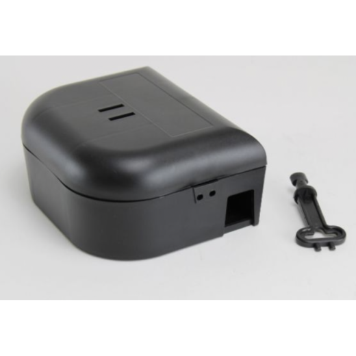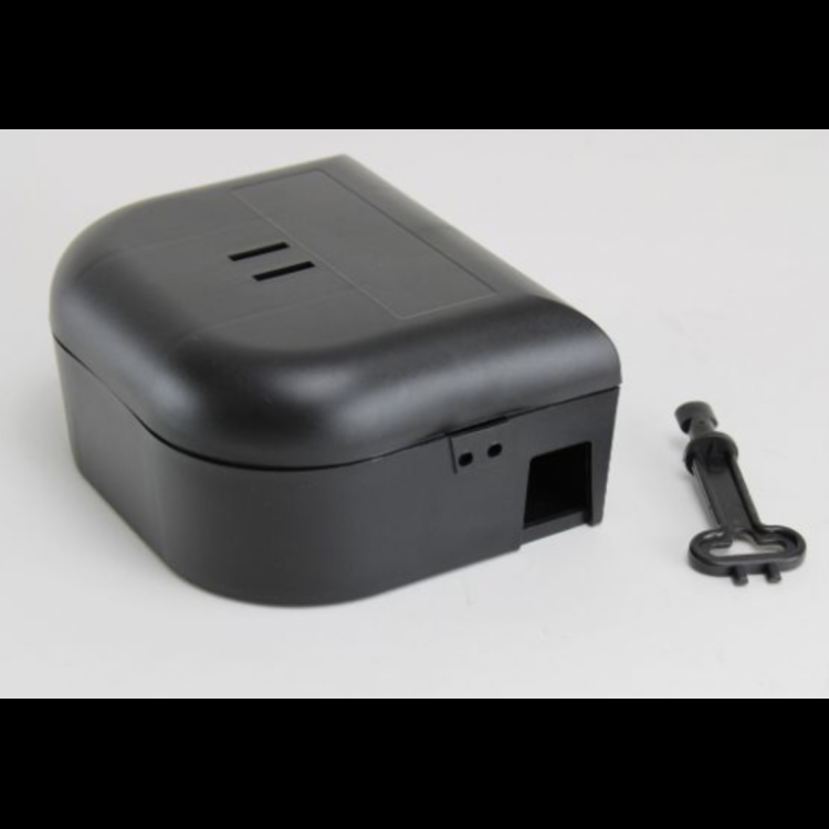 Cutie de control al rozătoarelor pentru plasarea momelilor otrăvitoare pentru șoareci. Momeala pentru șoareci este inaccesibilă animalelor de companie și copiilor, iar cutia poate fi deschisă doar cu cheia corespunzătoare.