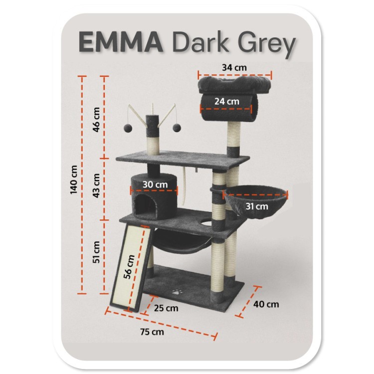 Stâlp de zgâriat pentru pisici EMMA, gri închis, cu niveluri multiple și jucării – Distracție și relaxare luxoasă pentru animalul tău de companie
