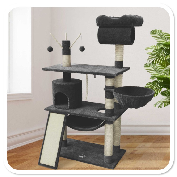 Animalul tău blănos se zgârie pe canapea și se cațără pe perdele? Gata cu stâlpul nostru de zgâriat răsfățat! Oferă-i pisicii tale un sanctuar luxos . Acest stâlp de zgâriat cu mai multe niveluri este combinația perfectă între confort, siguranță și distracție , fiind alegerea perfectă pentru toate nevoile pisicii tale. Dispune de două căsuțe confortabile , trei platforme ridicate, pompoane pentru joacă, două hamace și stâlpi de zgâriat din sisal. Designul modern în gri se va completa perfect interiorul tău.