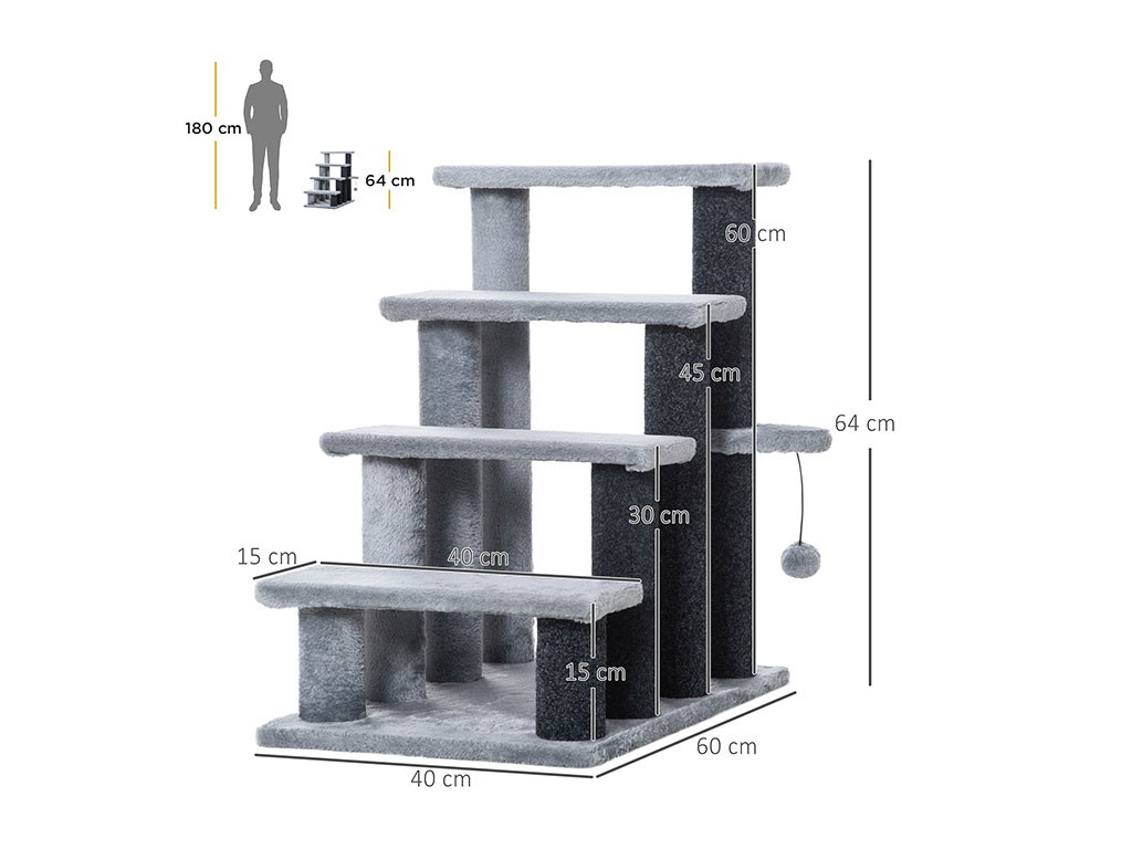 Scară pentru câini și pisici, cu patru trepte, pentru urcare ușoară , căptușită cu pluș moale, cu minge moale , dimensiuni treaptă 40x15 cm, dimensiuni totale 60x40x64 cm.