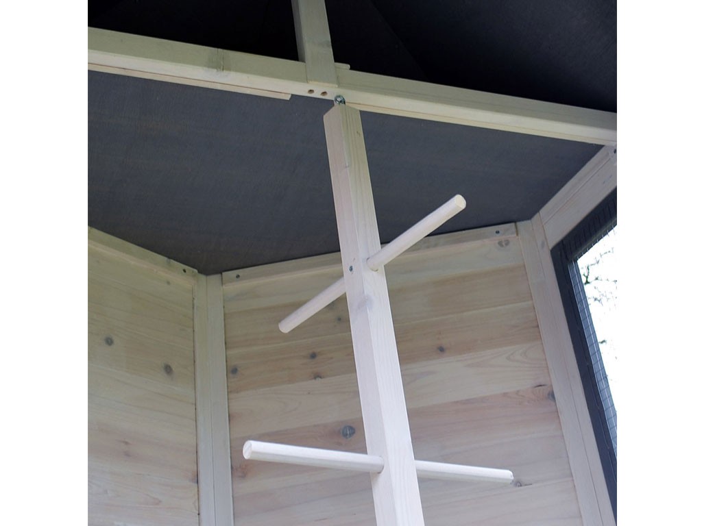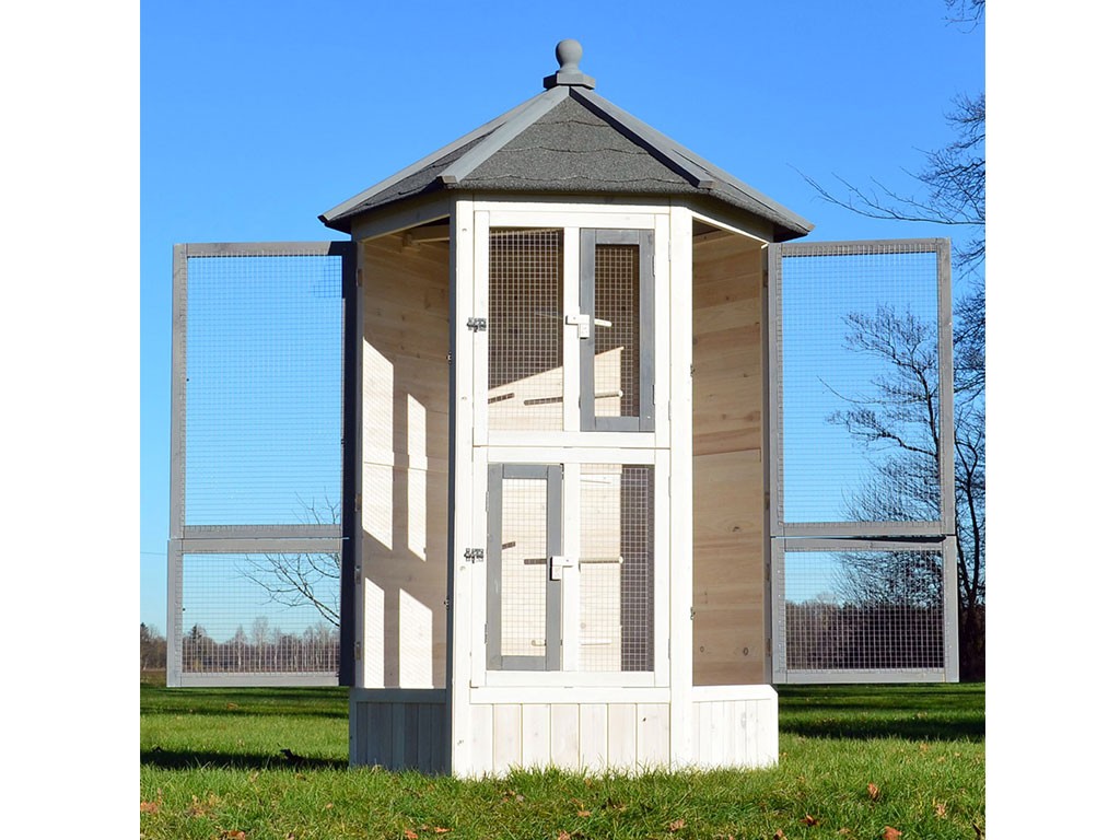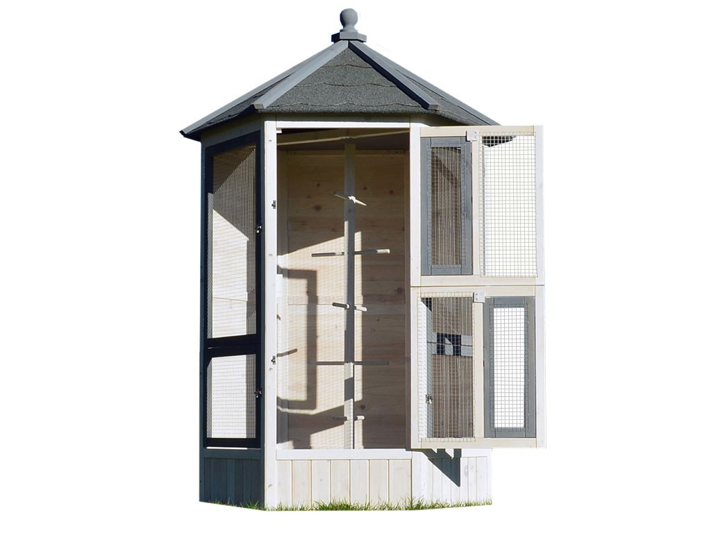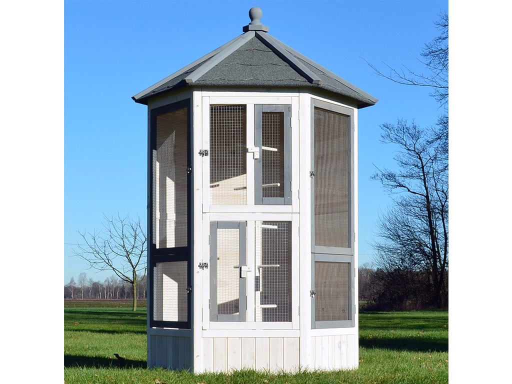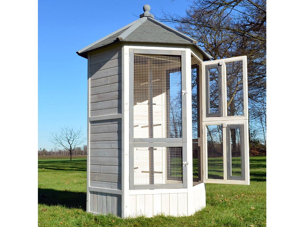 Colivia oferă, de asemenea, ușurință în întreținere datorită celor 6 uși care pot fi deschise împreună sau individual. Ușa din mijloc are și o altă ușă mai mică prin care puteți intra în siguranță în colivie. Pentru a prelungi durata de viață a volierei, vă recomandăm să o plasați sub un adăpost și să reînnoiți în mod regulat stratul protector de lemn .