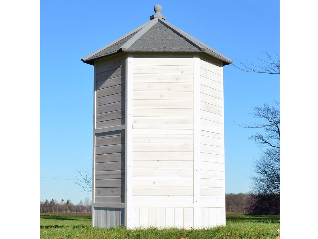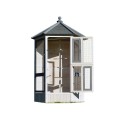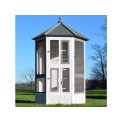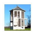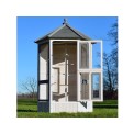 Volieră pentru păsări din lemn masiv, lemn de pin lăcuit, acoperiș bituminos, 6 uși care se deschid, 5 stinghii pe o bară de agățat, culoare albă elegantă, dimensiuni 100x100x183cm.