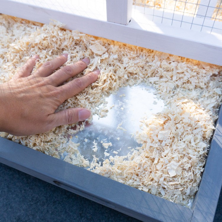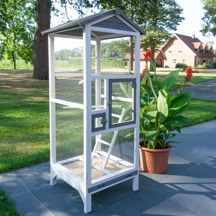 Acoperișul este acoperit cu asfalt. Livrarea include trei stinghii care pot fi amplasate individual în voliera. Păsările se pot relaxa și dormi pe ele. O scară mică le permite să urce și să coboare. Un sertar pentru excremente este integrat în partea inferioară a volierei. Sertarul detașabil pentru excremente facilitează curățarea.