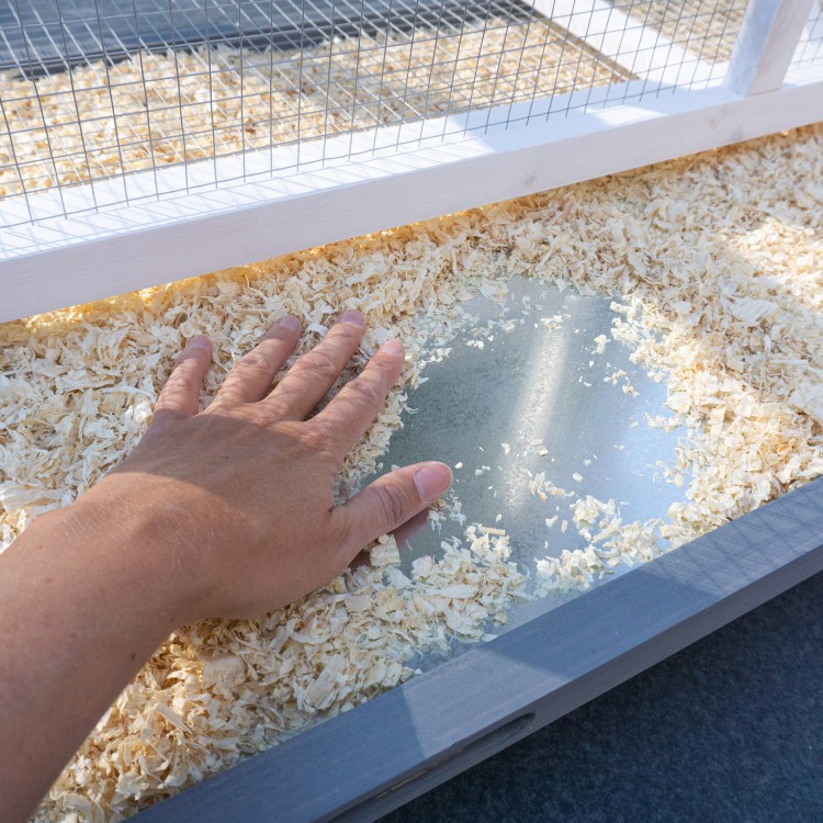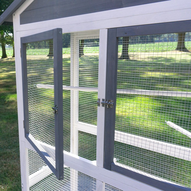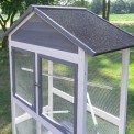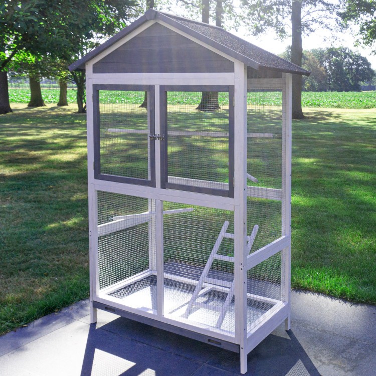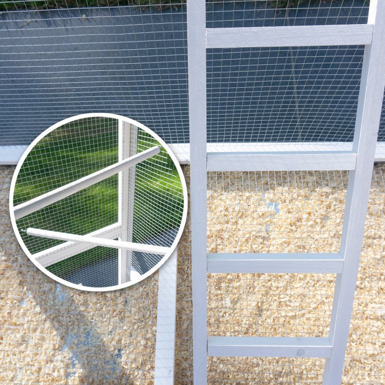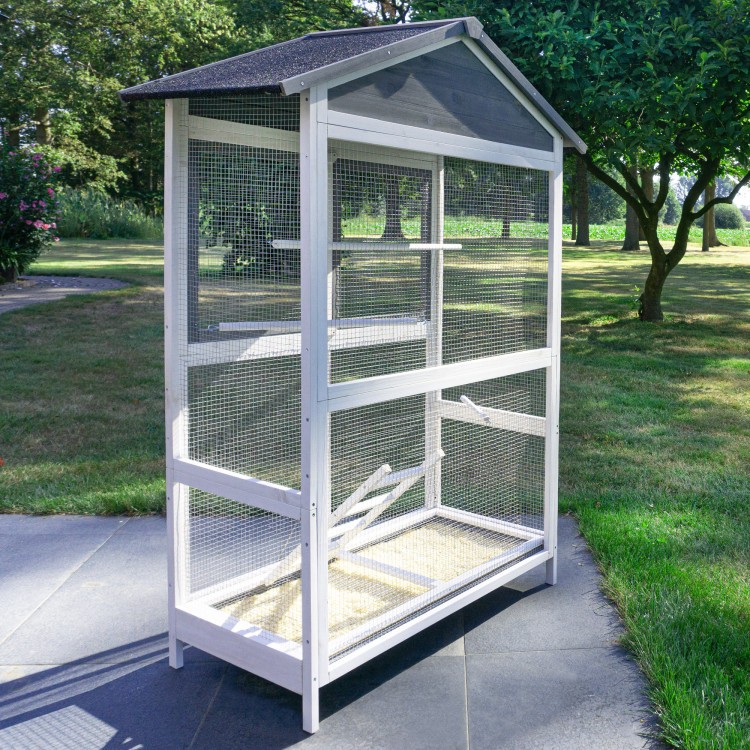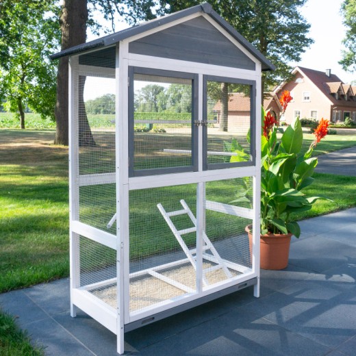 Acoperișul este acoperit cu asfalt. Livrarea include trei stinghii care pot fi amplasate individual în voliera. Păsările se pot relaxa și dormi pe ele. O scară mică le permite să urce și să coboare. Un sertar pentru excremente este integrat în partea inferioară a volierei. Sertarul detașabil pentru excremente facilitează curățarea.