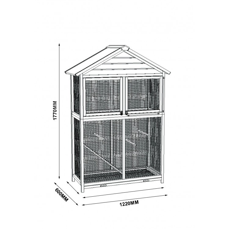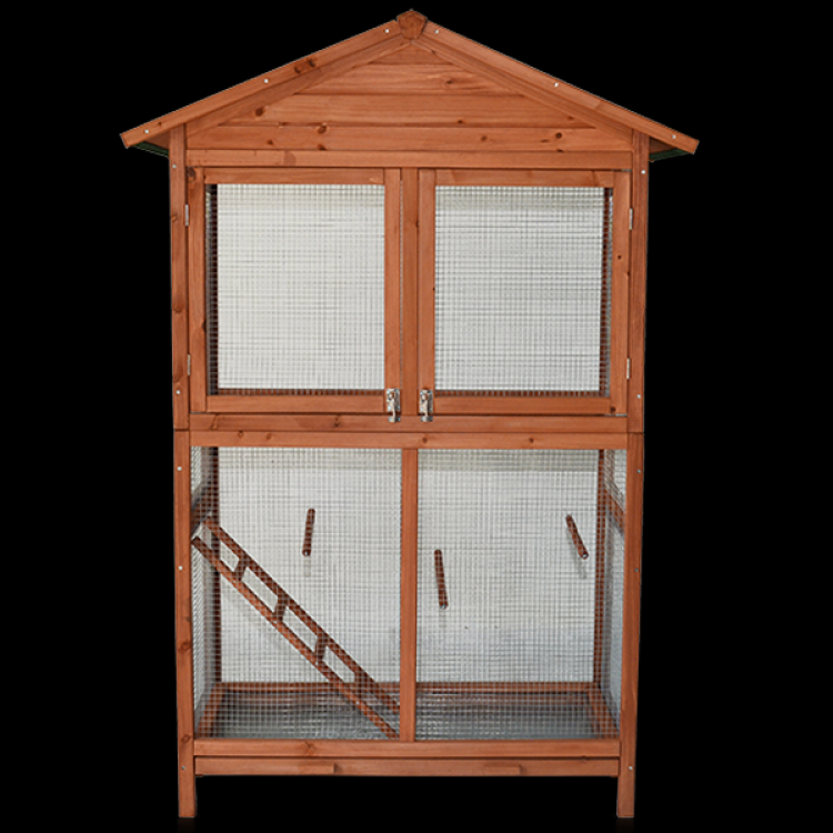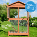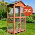 Acoperișul verde este acoperit cu asfalt. Livrarea include trei stinghii care pot fi amplasate individual în voliera. Păsările se pot relaxa și dormi pe ele. O scară mică le permite să urce și să coboare. Un sertar pentru excremente este integrat în partea inferioară a volierei. Sertarul detașabil pentru excremente facilitează curățarea.